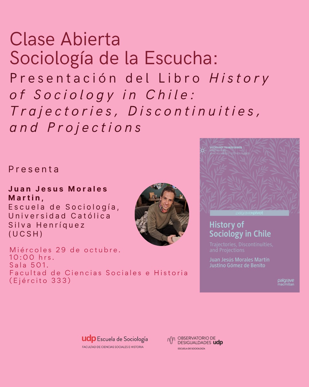 El Observatorio de Desigualdades UDP invita a participar en una nueva clase abierta del curso Sociología de la Escucha, impartido por Raimundo Frei, en la que el académico Juan Jesús Morales Martín presentará su libro History of Sociology in Chile: Trajectories, Discontinuities, and Projections (Palgrave Macmillan).